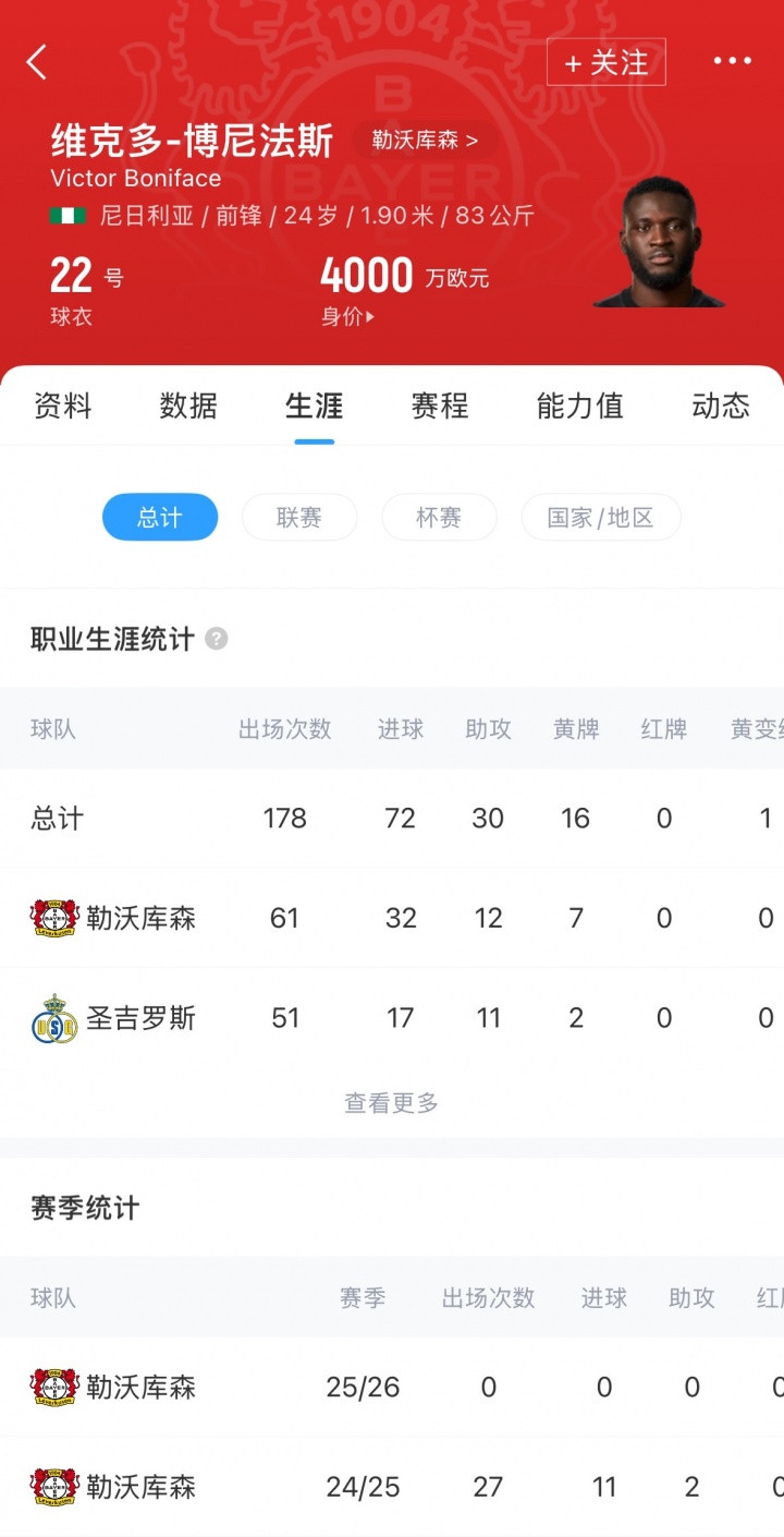 博尼法斯现年24岁,尼日利亚前锋,身高1米90。他在2023年以2260万欧元加盟药厂,并随队捧起德甲冠军以及德国杯冠军。上赛季博尼法斯总计为球队出场27次,贡献11球1助。目前球员德转身价为4000万欧元。