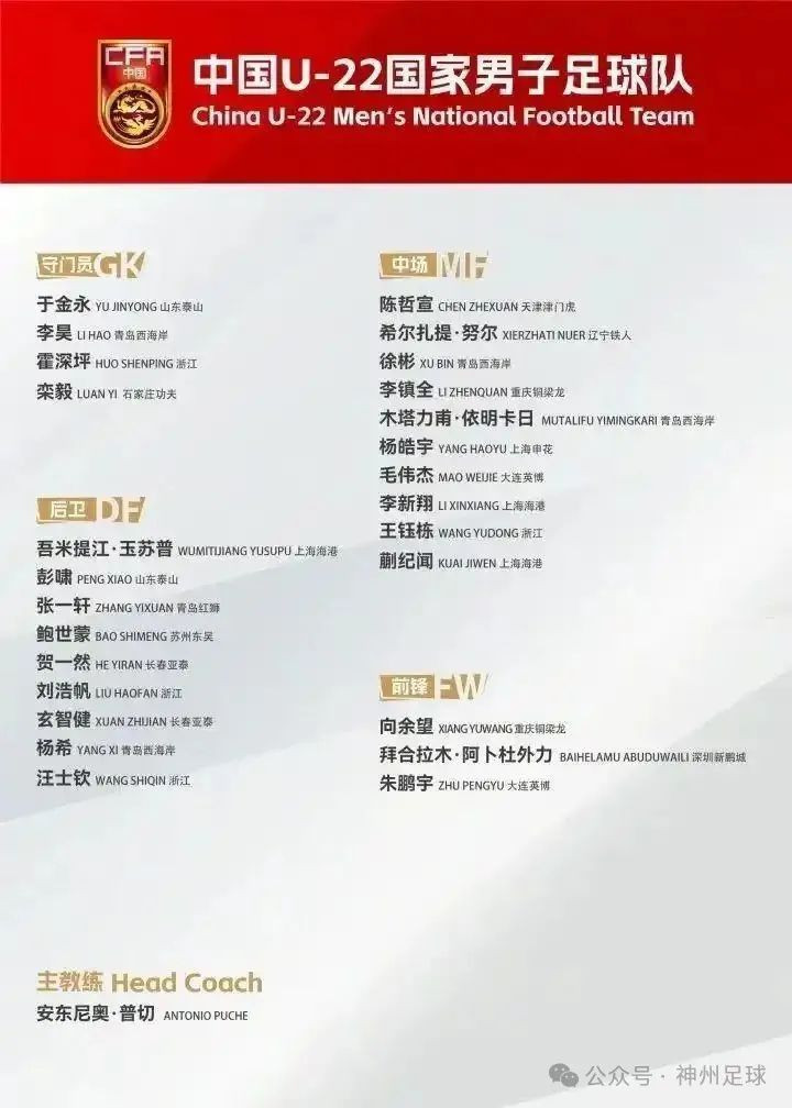 8月23日,中国足协公布新一期U22国家队大名单,目标直指9月上旬的U23亚洲杯预选赛。据《东方体育日报》透露,足协内部已明确提出硬性要求:“一定出线”。