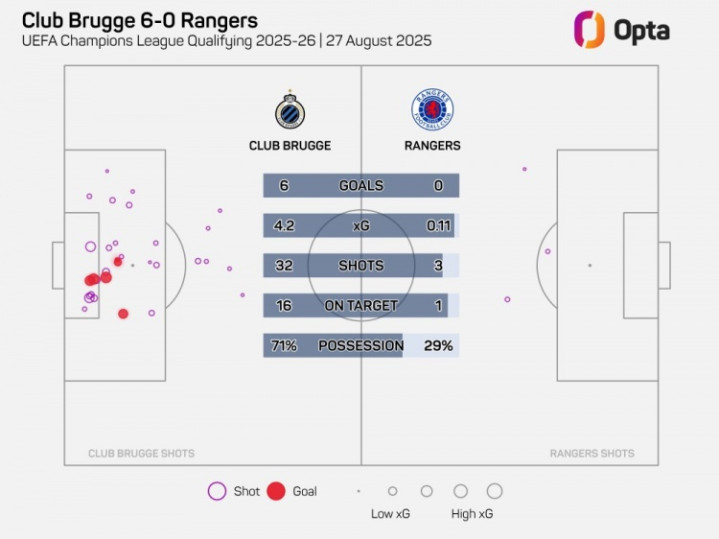 据OptaJohan的数据统计,布鲁日6-0大胜流浪者,这是他们自2001年9月27日(7-1尼科西亚奥林匹亚科斯)以来在欧战中最大比分的胜利。