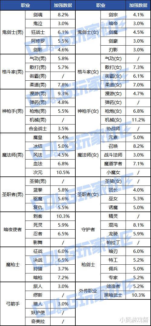 当然最无语的是加强得到大幅度阉割的,特别是剑魂来说,韩服加强11.9%,国服才加强8.2%,阉割了3.7%的数据,都比一些职业,例如剑豪、刃影加强的幅度都大了 。