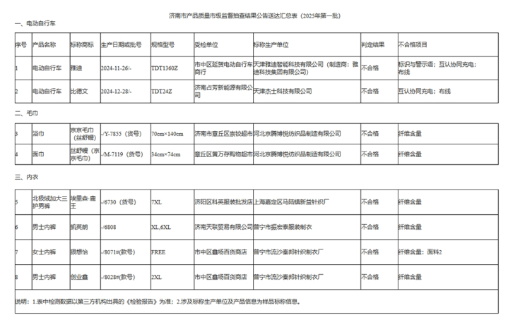 据悉,根据《中华人民共和国产品质量法》《山东省实施办法》《产品质量监督抽查管理暂行办法》(总局令第18号)等法律法规规章,济南市市场监督管理局组织了对重点工业产品进行质量市级监督抽查,2025年第一批重点工业产品质量市级监督抽查主要涉及电动自行车、内衣、毛巾等产品。