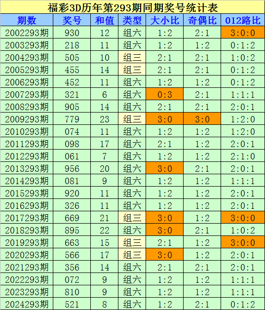 奇偶比推荐:在第293期历史同期开奖中,奇偶比0:3没有出现,奇偶比3:0开出1次,奇偶比2:1开出9次,奇偶比1:2开出13次,奇偶奖号总个数比34:35,奇偶号码出现比例基本平衡,今年同期看好奇数热出,防全奇组合。
