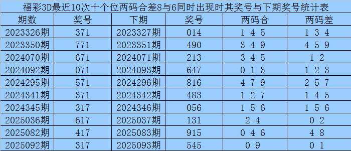 从以上统计可以看出,十个位两码合差8与6同时出现之后其下期两码合差表现最热的4个分别为:1245,本期十个位两码合差可以参考这四码中的数据。