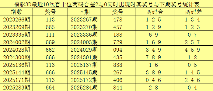 从以上统计可以看出,百十位两码合差2与0同时出现之后其下期两码合差表现最热的4个分别为:1249,本期百十位两码合差可以参考这四码中的数据。