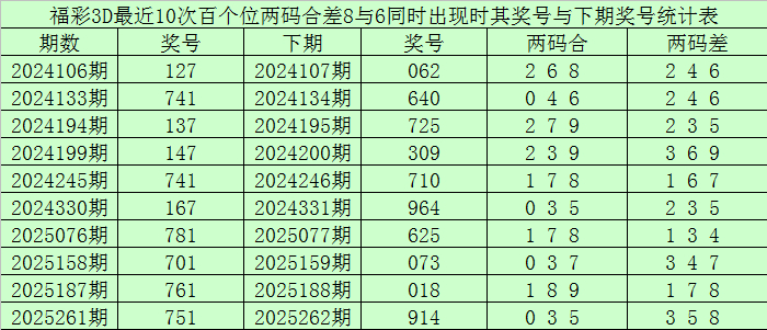 百个位合差分析:上期奖号百个位开出17组合,两码合为8,两码差为6,最近10次百个位两码合8与两码差6同时出现时,其奖号和下期奖号分别为: