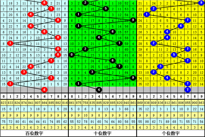 从以上统计可以看出,百个位两码合差8与6同时出现之后其下期两码合差表现最热的4个分别为:1237,本期百个位两码合差可以参考这四码中的数据。
