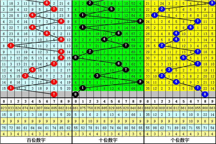 百位:2025288期-2025292期出号:74371,振幅为6点,分布比较分散,本期预计百位走大,参考7。